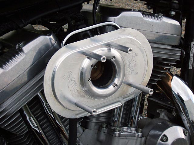 2. Remove the factory air cleaner per the instructions in the service manual, leaving the carburetor or throttle body in place. EFI Sportsters have a support bracket for the throttle body, leave this bracket in place. Carbureted Sportsters will require a support bracket, available from HAMMER PERFORMANCE.